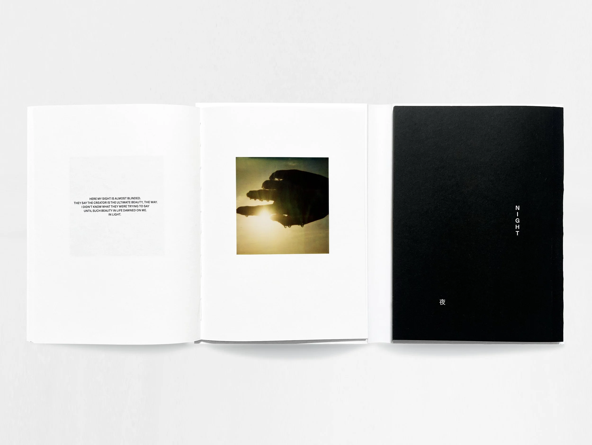 The double sided swiss-bound book opens up to reveal two separate collections – Day & Night, each book capturing the spontaneity in life and the subtle energy of day time and night time. The day collection conjures a purity and lightness in spirit, while the night collection purveys a darker and more mysterious mood. Both find beauty and magic in the world around us which Shya presents so effortlessly in the Polaroids and accompanying text.